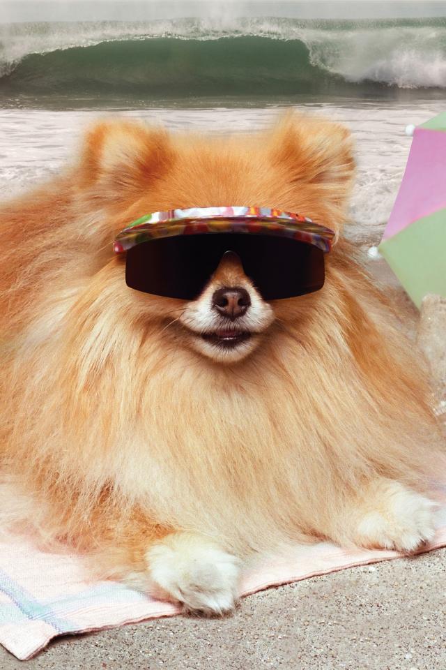 Wallpaper Funny Spitz in glasses sunbathing on the beach