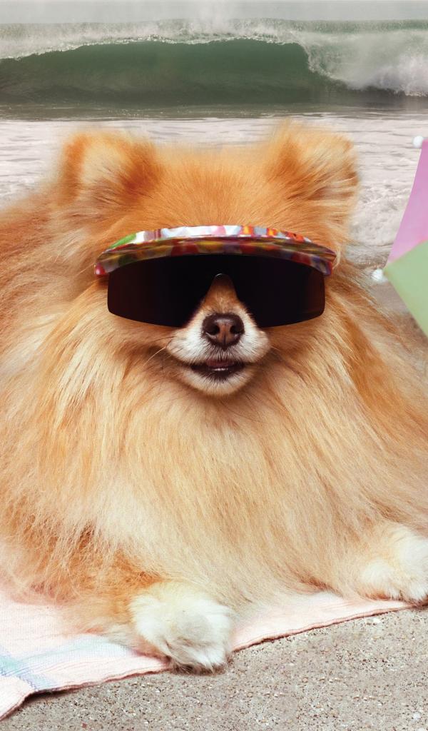 Wallpaper Funny Spitz in glasses sunbathing on the beach
