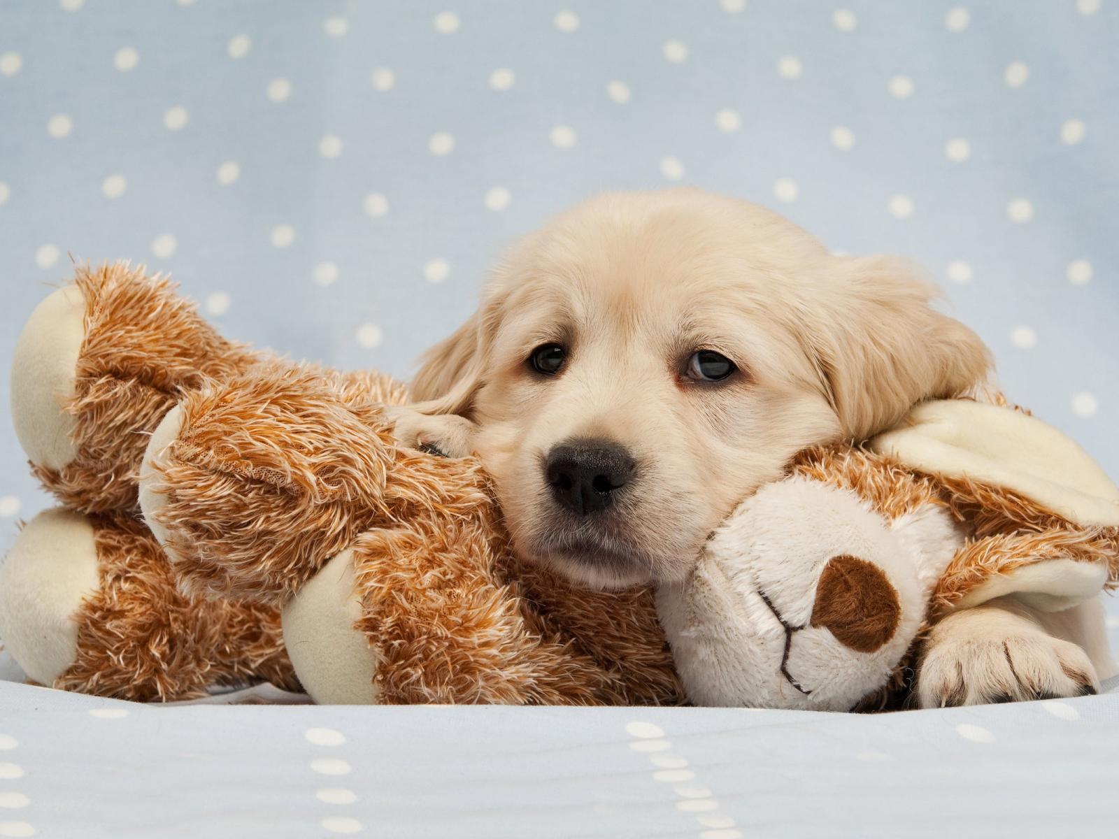 Wallpaper A sad puppy of a golden retriever lies on a soft toy