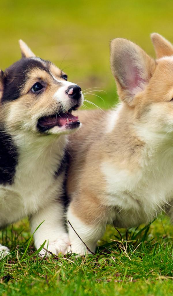 Wallpaper Small Welsh Corgi puppies on the green grass