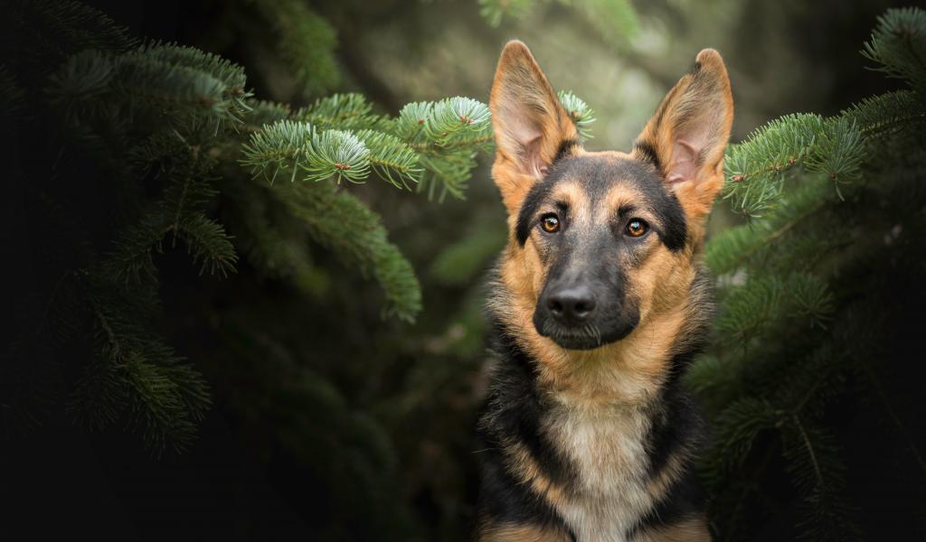 Wallpaper German shepherd sits in green spruce branches