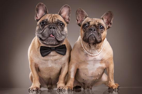 Wallpaper Two english bulldogs in fancy dresses on a white background