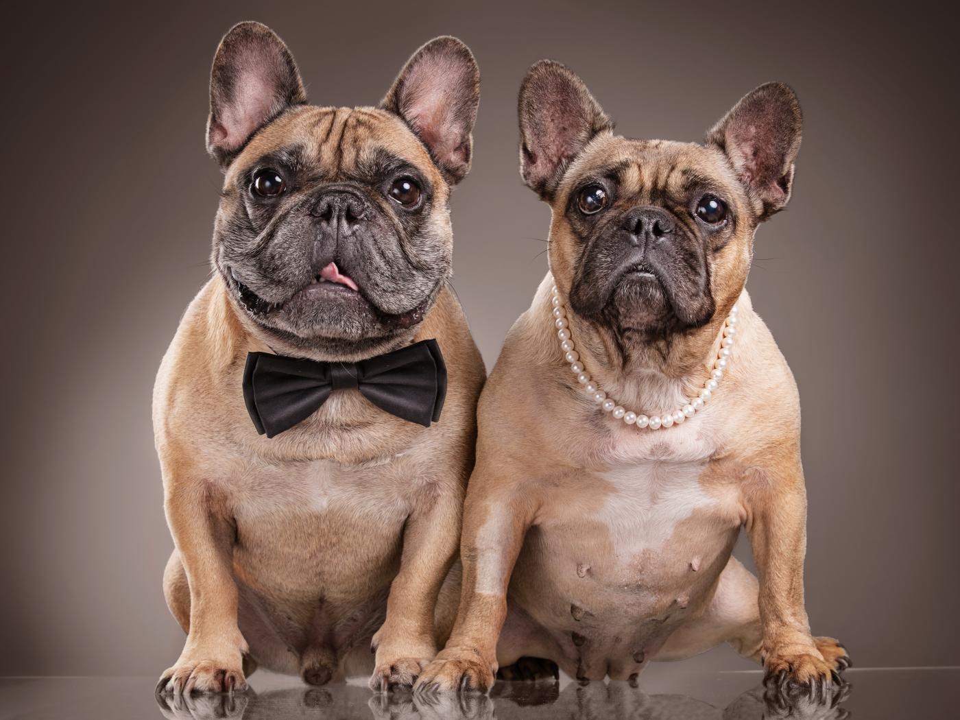 Wallpaper Two english bulldogs in fancy dresses on a white background