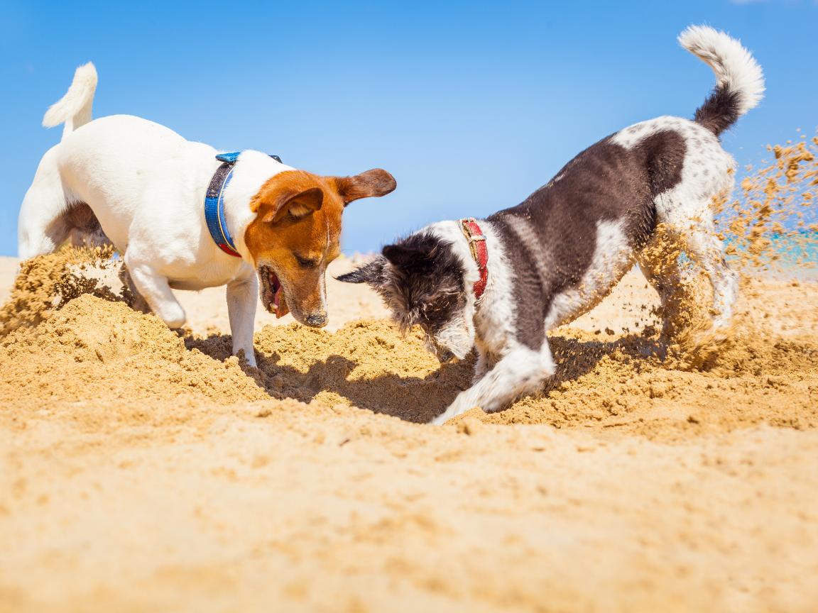 Wallpaper Two Jack Russell Terrier dogs dig sand on the beach