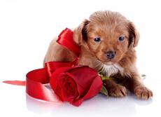 Wallpaper Puppy in glasses and a red rose flower on a white background