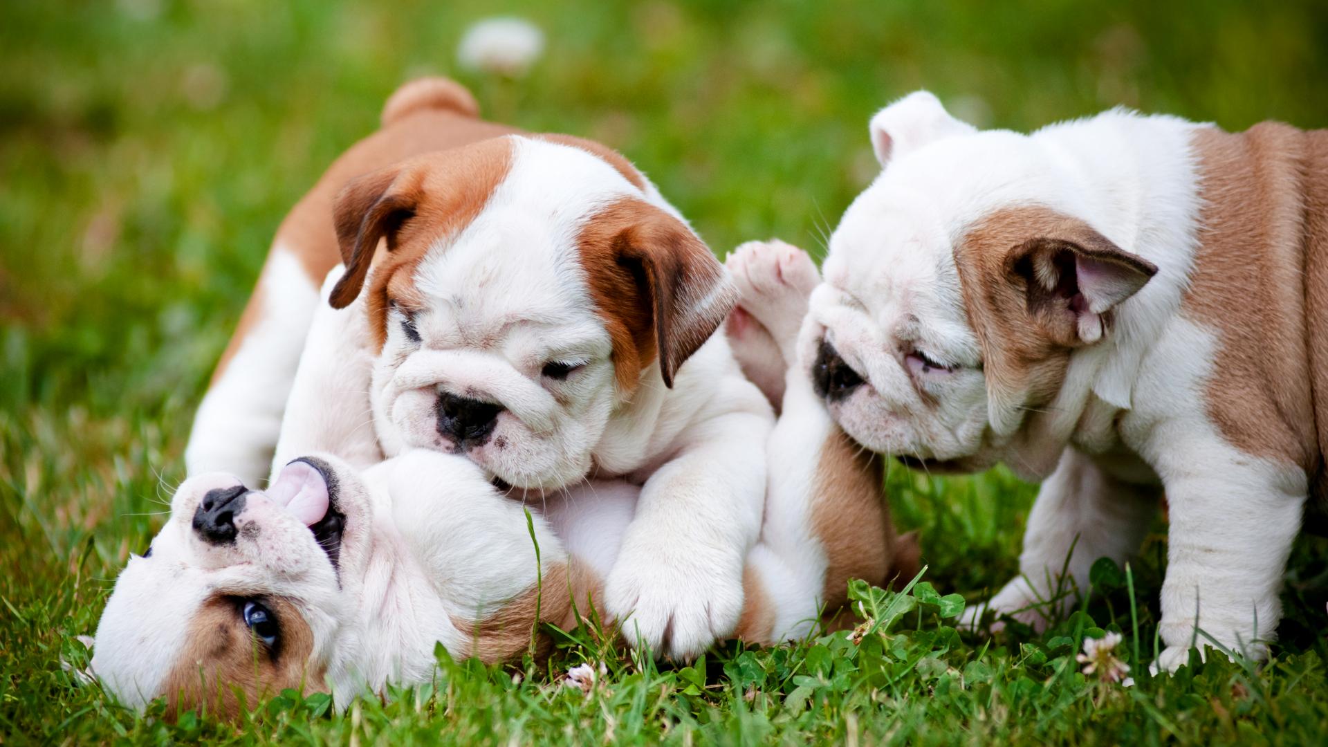 Wallpaper Three puppies of a bulldog playing on green grass