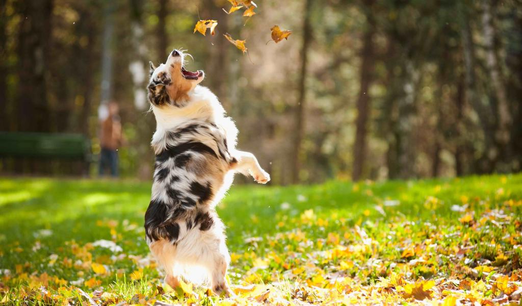 Wallpaper Australian Shepherd catches yellow leaves