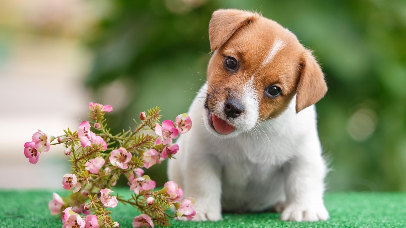 Wallpaper Funny puppy Jack Russell Terrier with flowers