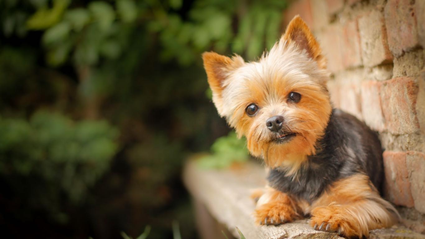 Wallpaper Little Yorkshire Terrier puppy on a brick wall background