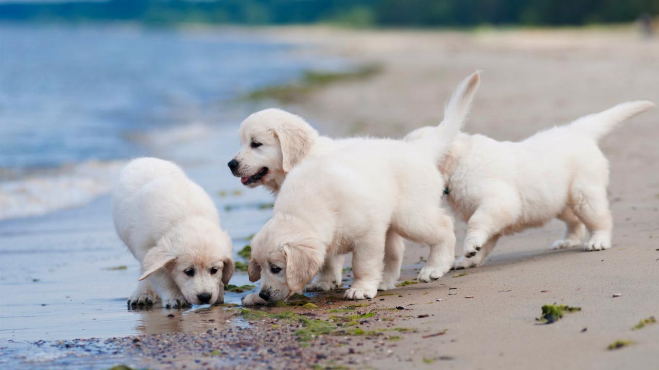 Wallpaper Four small white puppy of a golden retriever on the beach