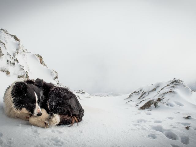 Wallpaper Sad dog sleeps on snow in winter