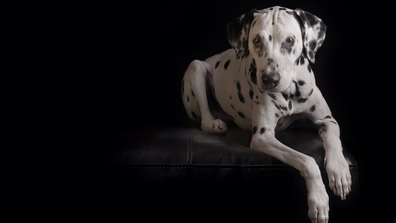 Wallpaper Dalmatians lay on a leather sofa on a black background