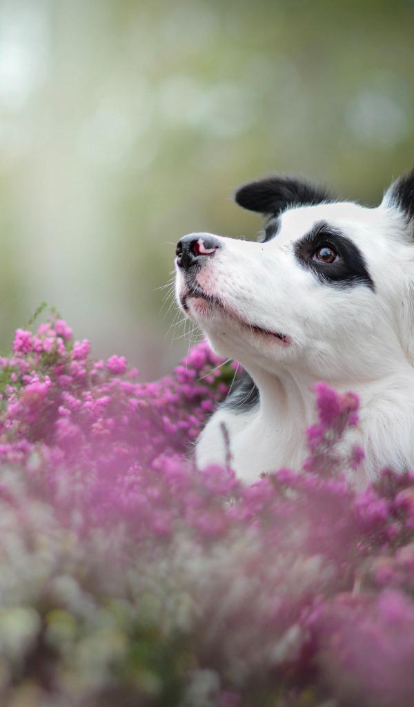 Wallpaper The dog breeds a border collie sitting in lilac flowers