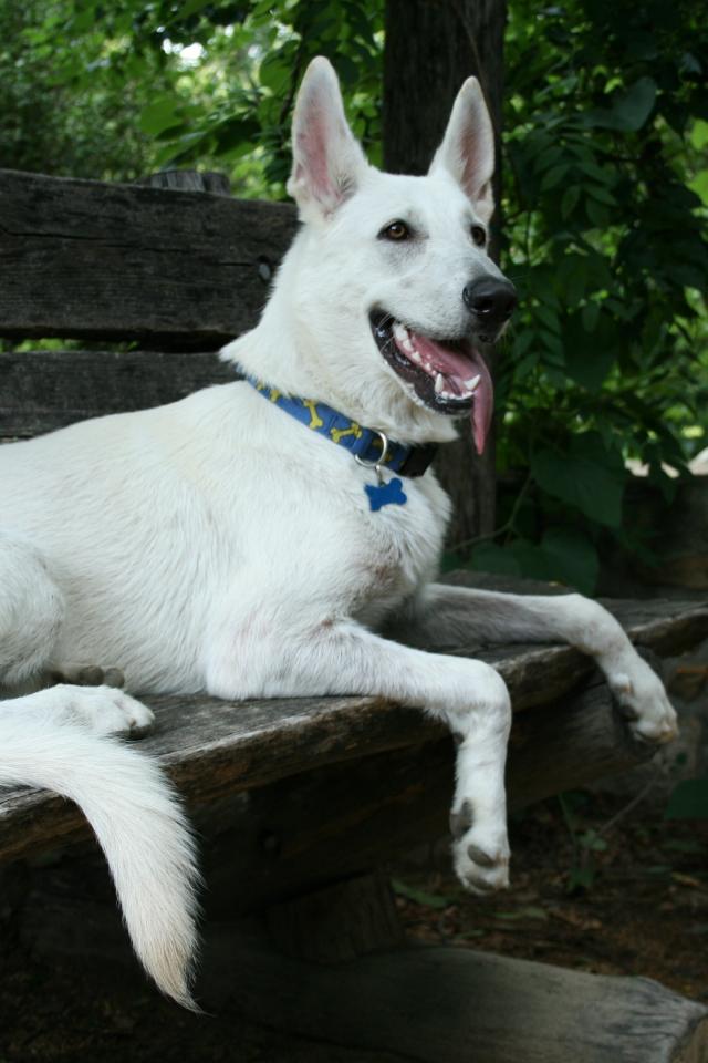 Wallpaper White Swiss Shepherd lies on a wooden bench