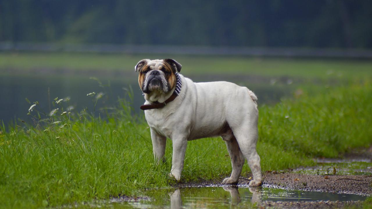 » Wallpaper Bulldog walks in puddles in summer
