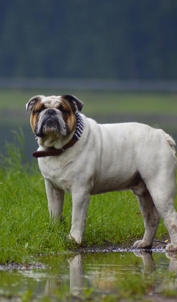 » Wallpaper Bulldog walks in puddles in summer