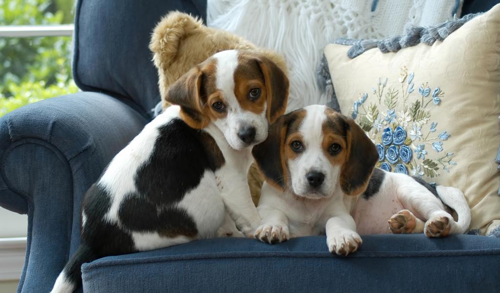 Wallpaper Two small beagle puppies sitting on the couch