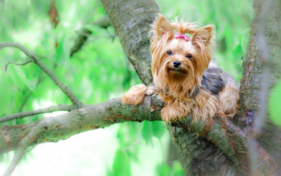 Wallpaper Yorkshire Terrier sits on a tree branch