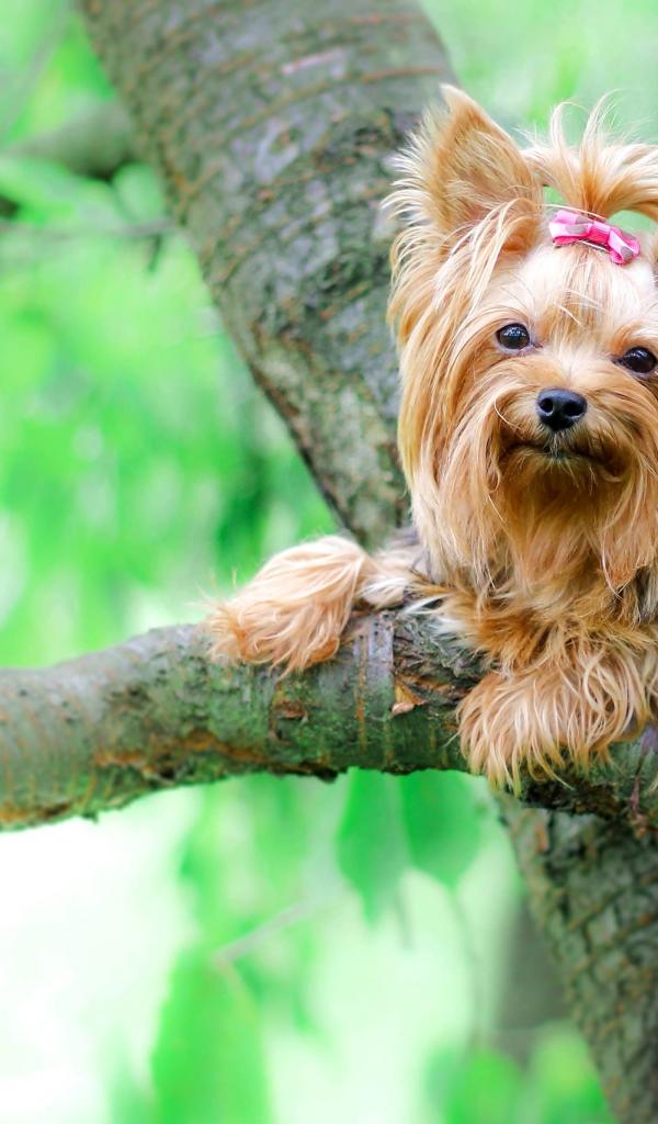 Wallpaper Yorkshire Terrier sits on a tree branch