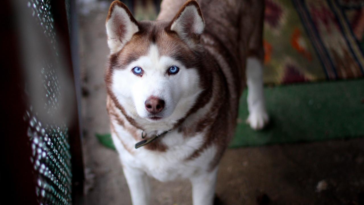 Wallpaper Sad blue-eyed husky with a leash