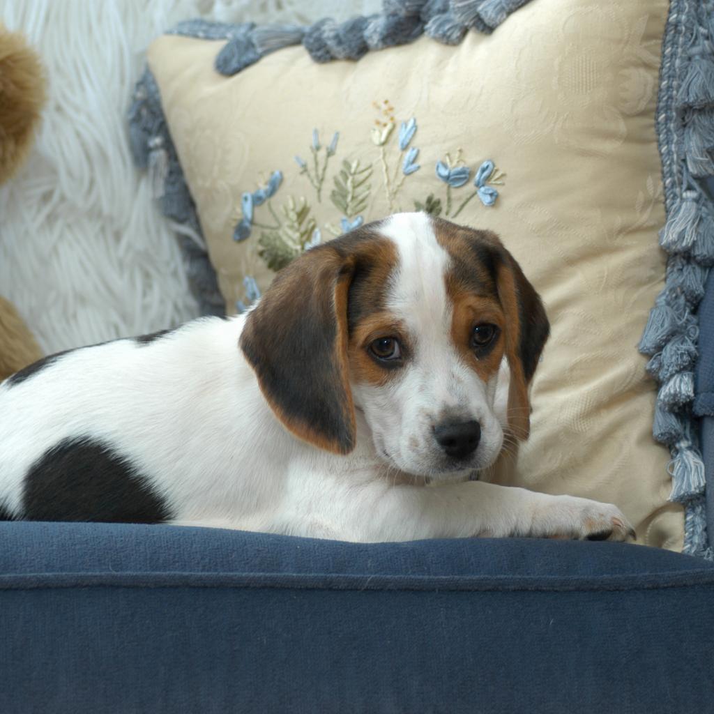Wallpaper A small beagle puppy lies on a sofa with cushions