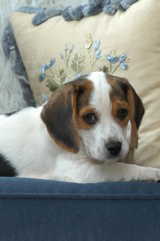 Wallpaper A small beagle puppy lies on a sofa with cushions