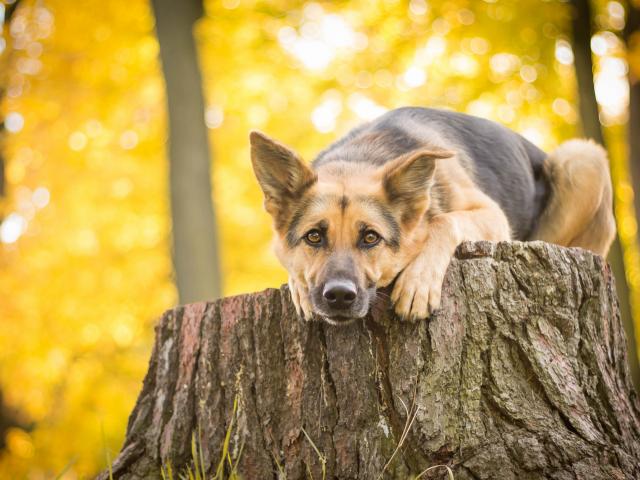 Wallpaper German Shepherd lies on a stump