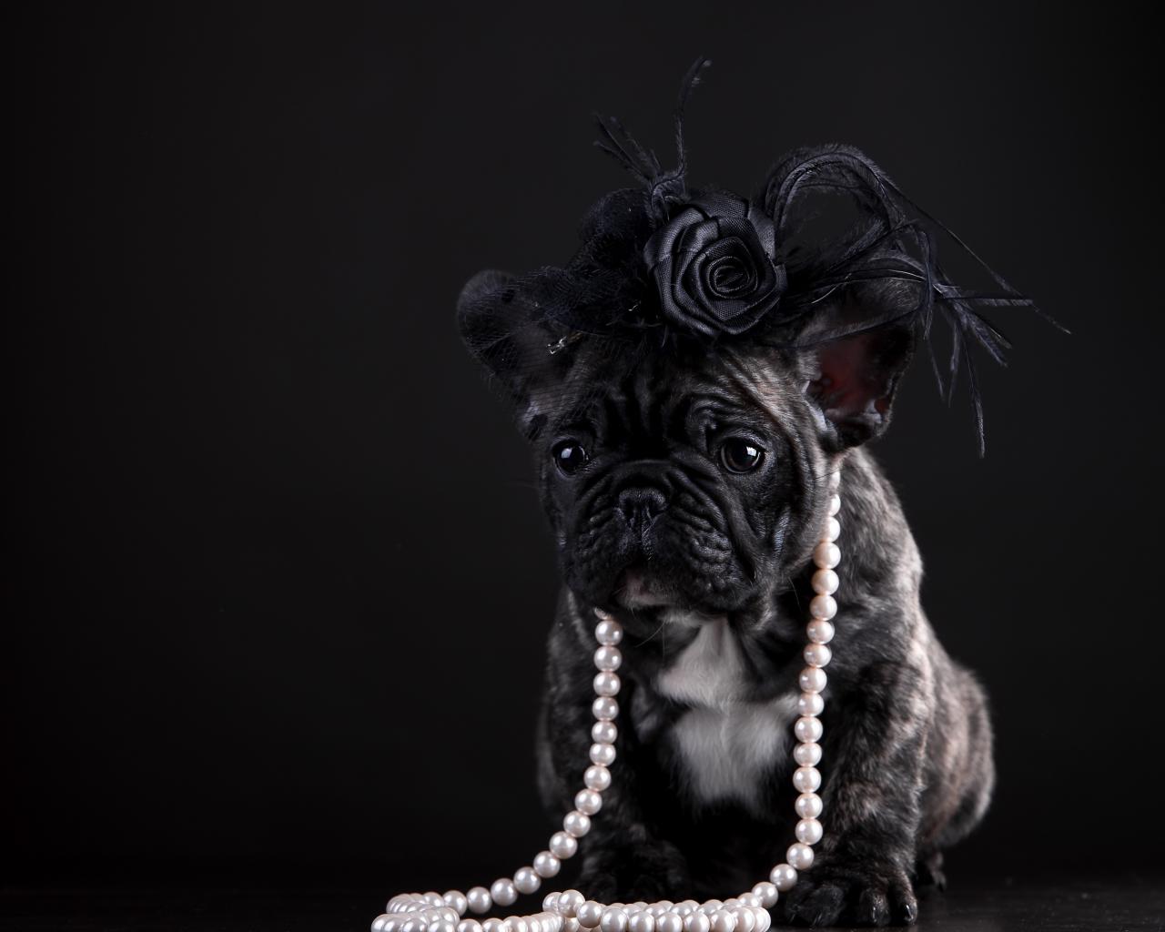 Wallpaper A puppy of a French bulldog in beads and a hat