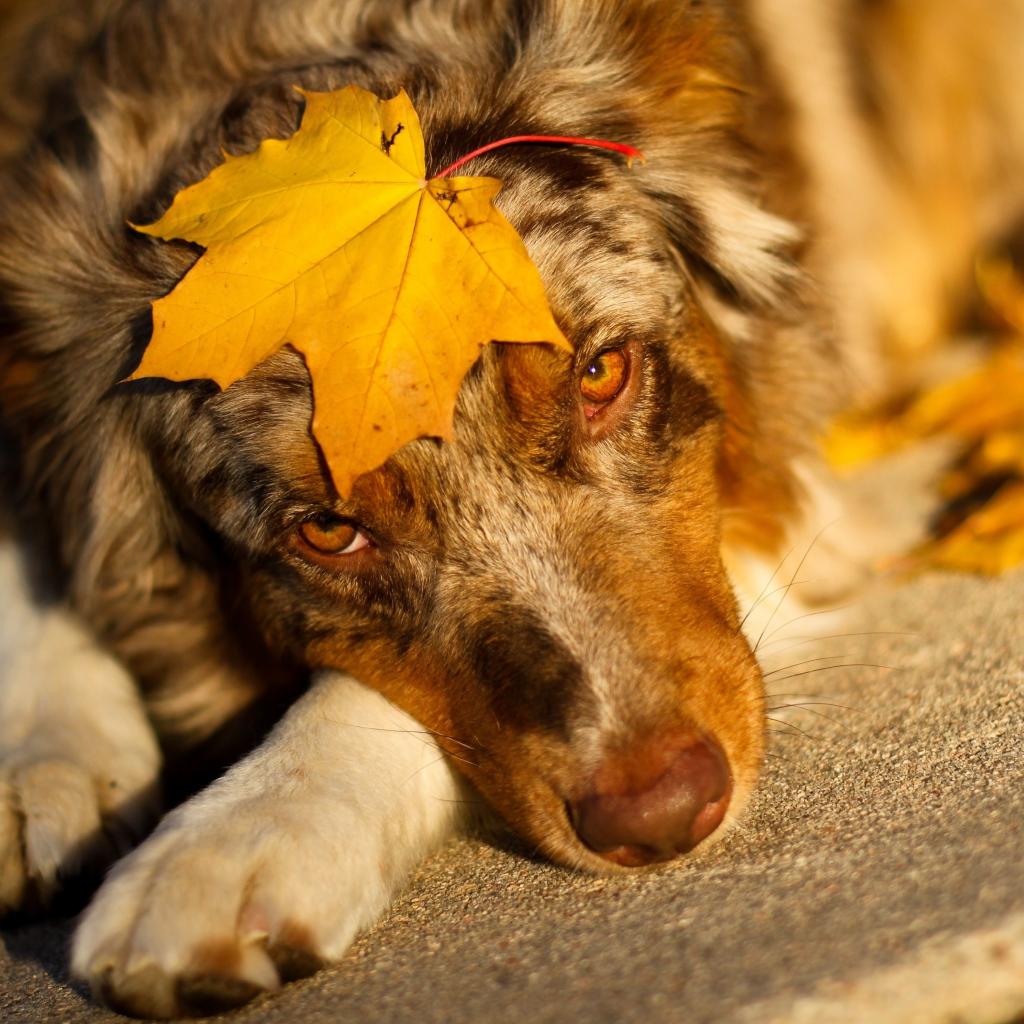 Wallpaper The dog lies lying with a yellow leaf on the muzzle