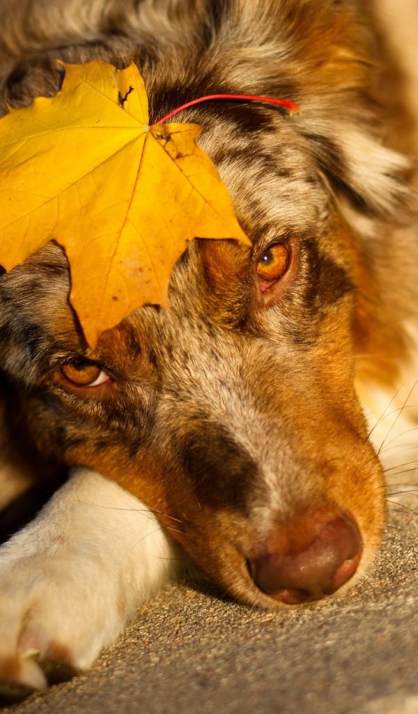Wallpaper The dog lies lying with a yellow leaf on the muzzle