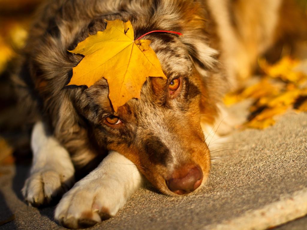 Wallpaper The dog lies lying with a yellow leaf on the muzzle