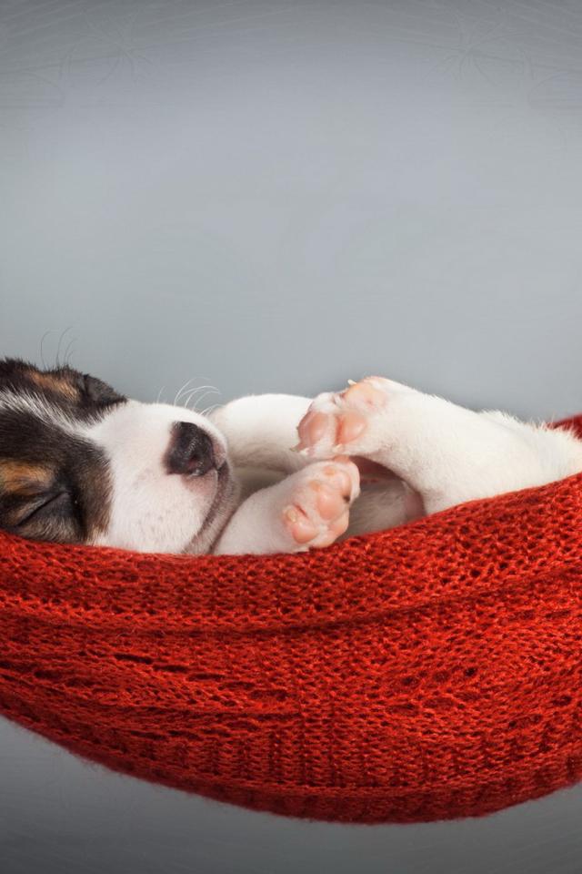 Wallpaper A small puppy sleeps in a hammock on a gray background