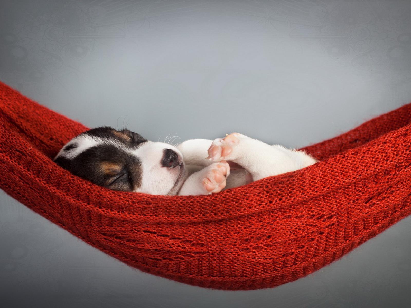 Wallpaper A small puppy sleeps in a hammock on a gray background