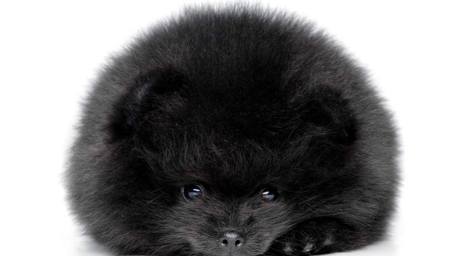 Wallpaper Fluffy black pomeranian dog on white background