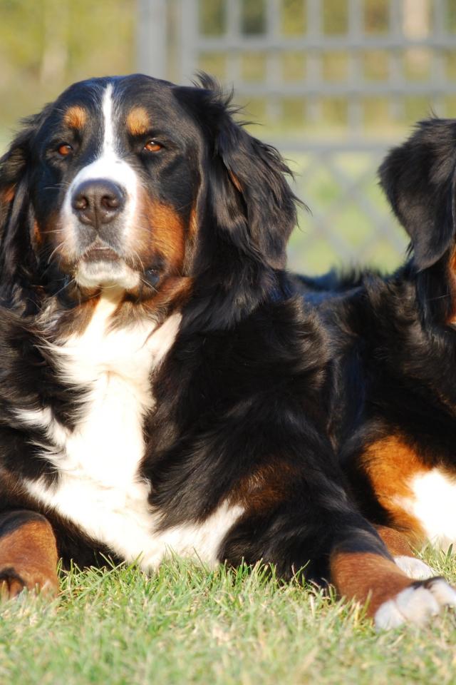 Wallpaper Two Bernese Mountain Dog dogs lie on the green grass