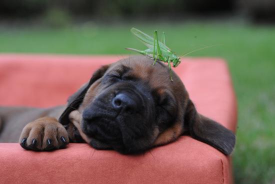 Wallpaper Sleeping puppy Bullmastiff with a green grasshopper on his head