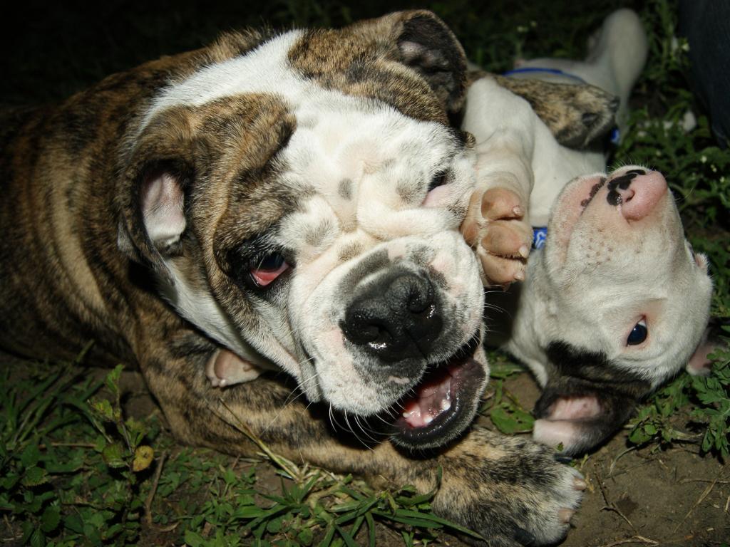 Wallpaper English Bulldog with puppy playing on the grass