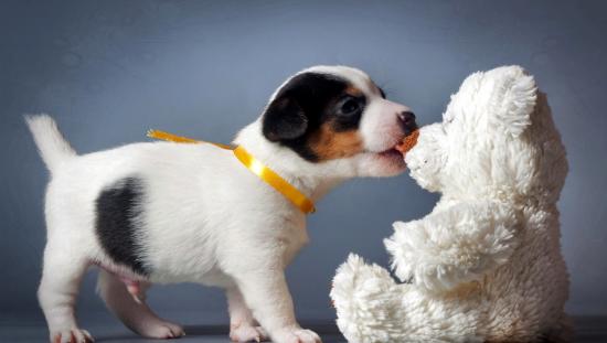 Wallpaper Puppy Jack Russell Terrier bites a white teddy bear