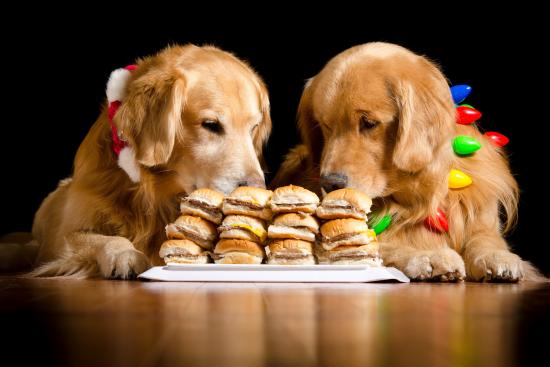 Wallpaper Two golden retrievers eat hamburgers