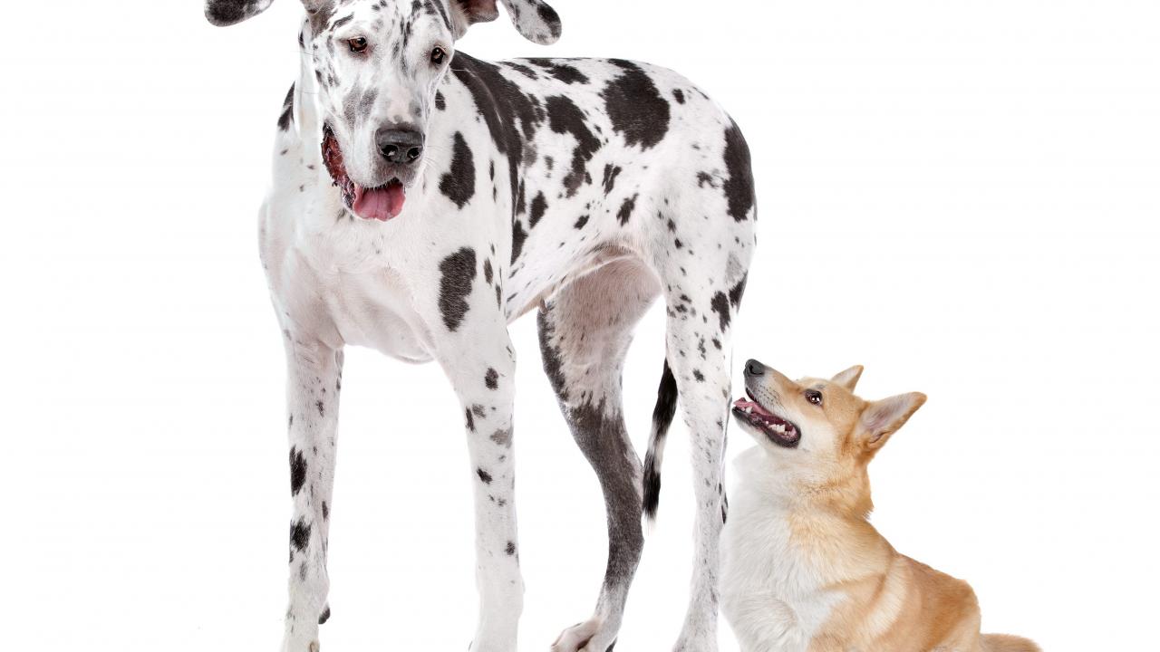 Wallpaper Great Dane and Welsh Corgi on a white background