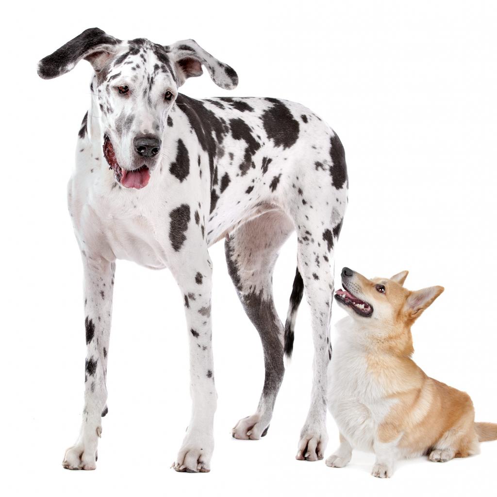 Wallpaper Great Dane and Welsh Corgi on a white background