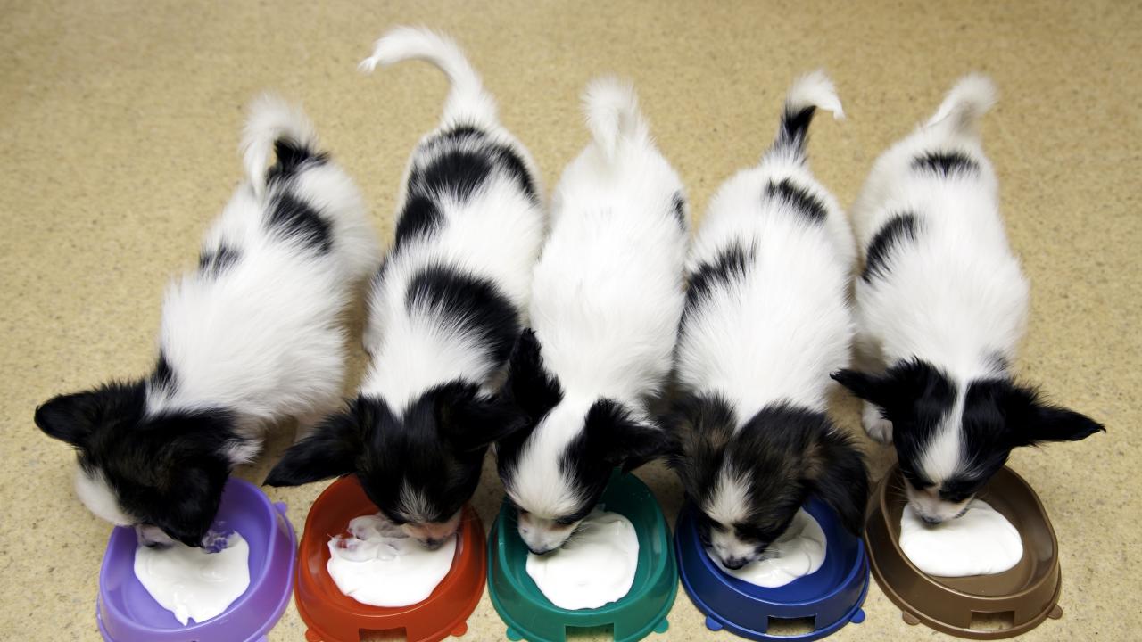 Wallpaper Lovely puppy puppies eat from bowls