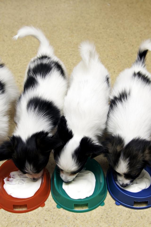 Wallpaper Lovely puppy puppies eat from bowls