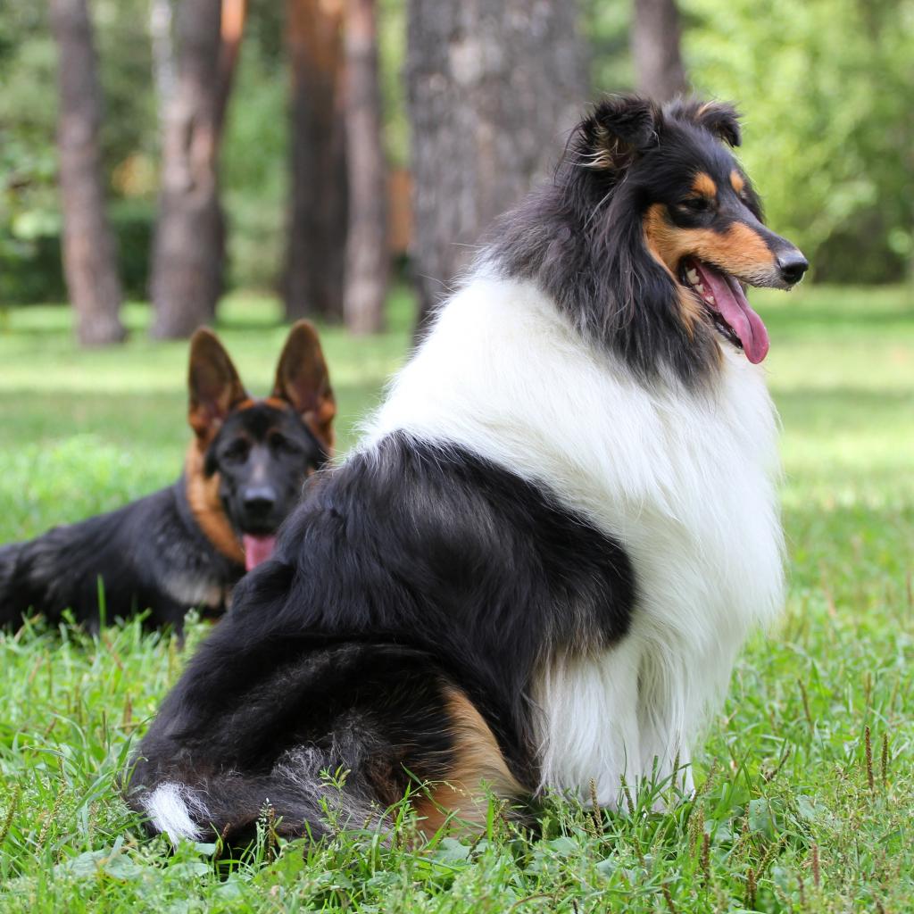 » Wallpaper German shepherd and collie lie on green grass