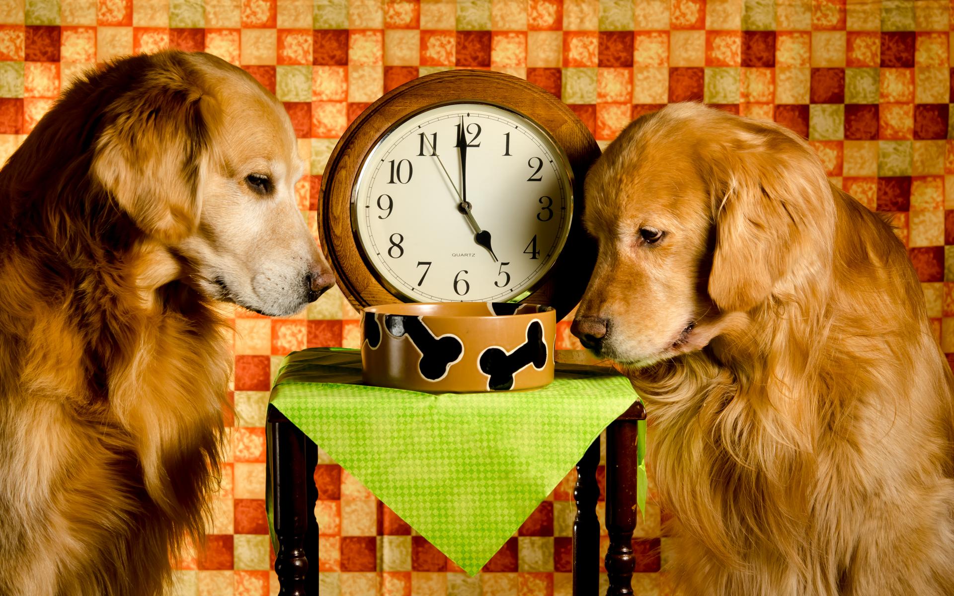 Wallpaper Two golden retrievers wait for the feed from the clock