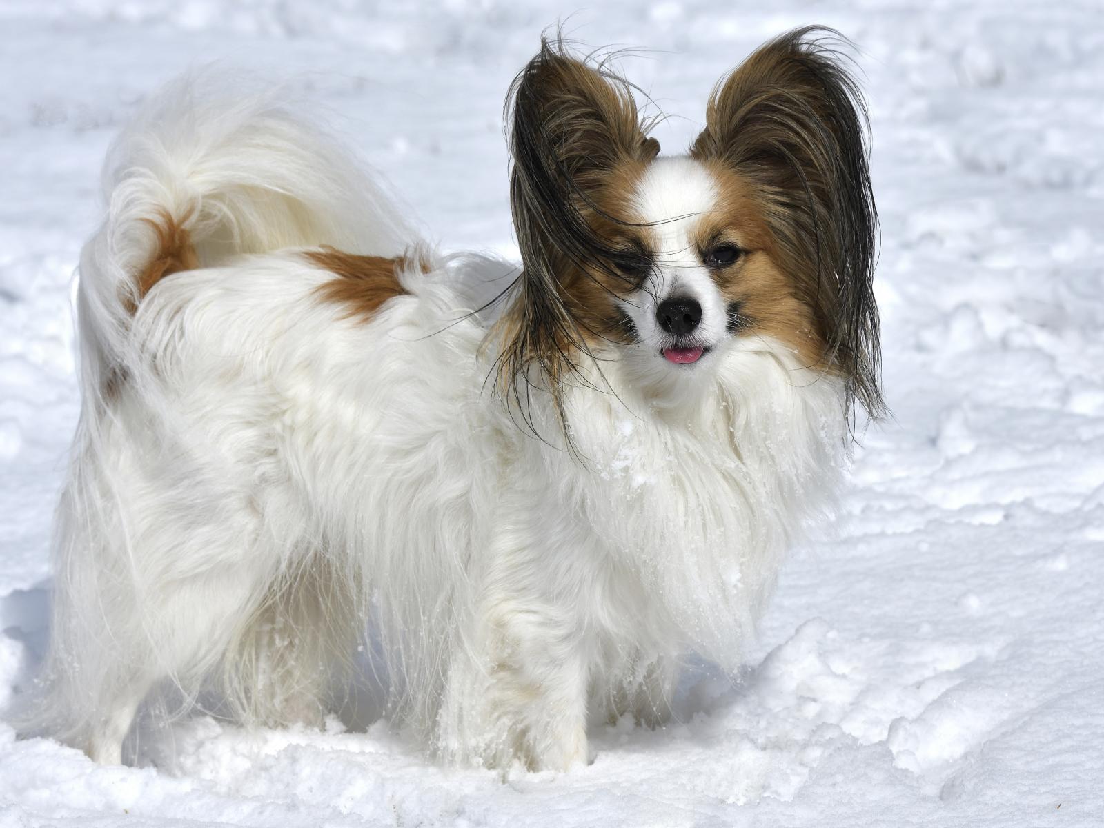 Wallpaper Dog of the breed King Charles Spaniel stands on the snow