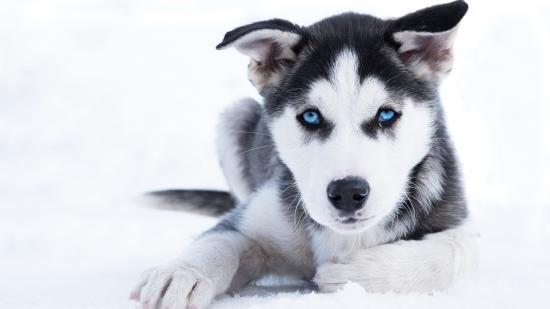 Wallpaper A blue-eyed husky puppy lies on the snow