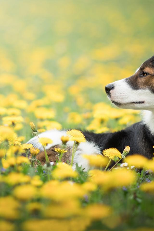 Wallpaper Dog breed Border Collie lies in yellow dandelions