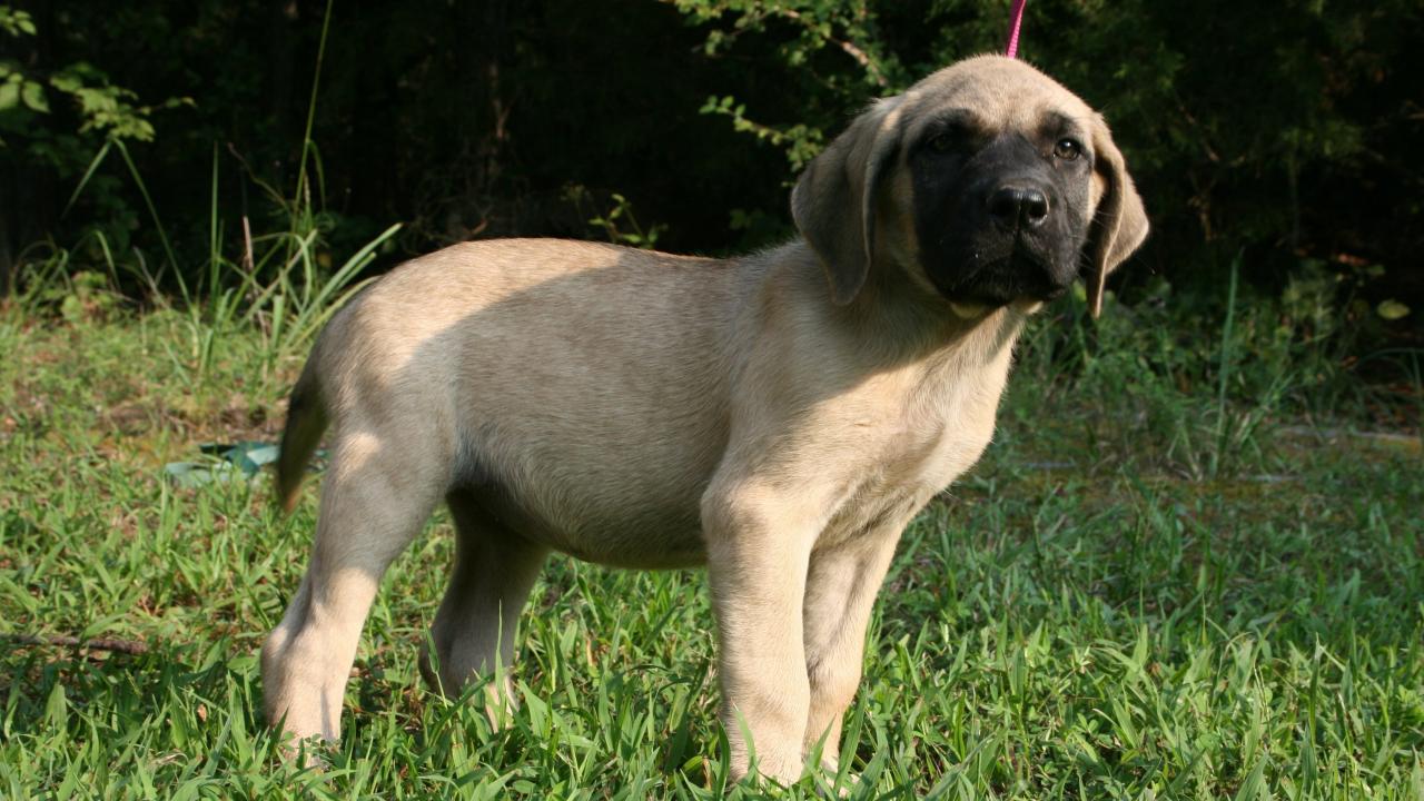 Wallpaper Puppy English mastiff stands on green grass