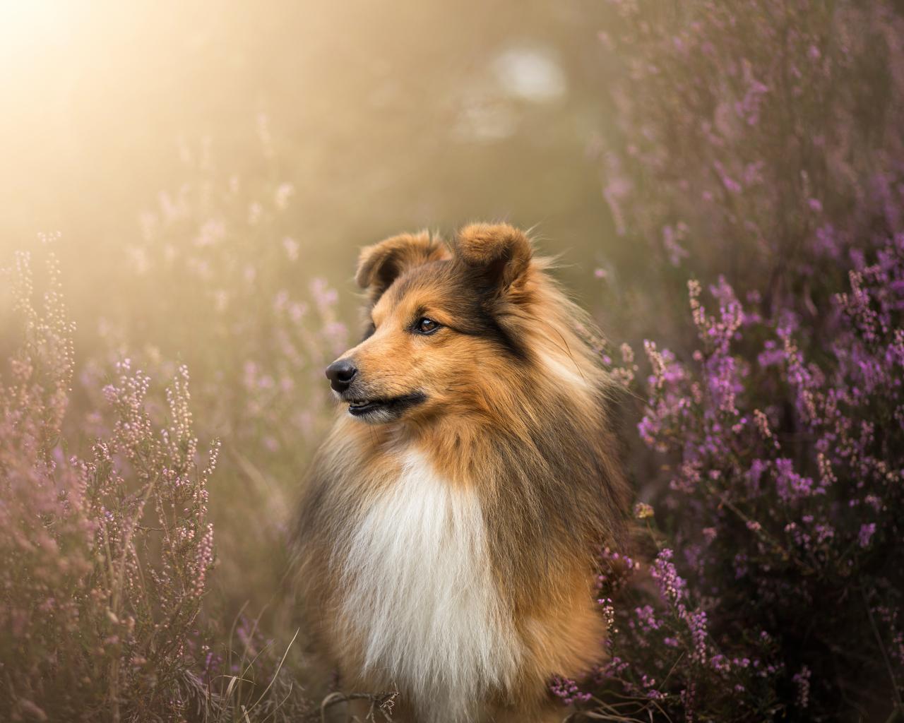 Wallpaper Two beautiful Sheltie breed dog in flowers